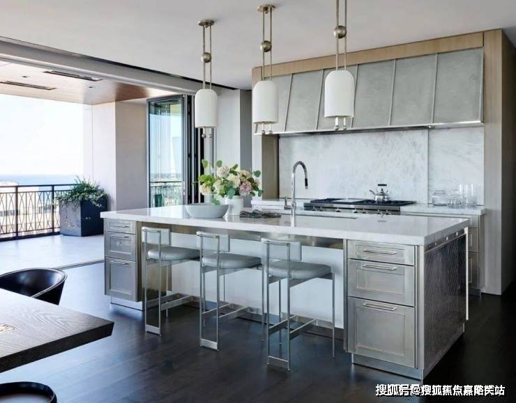 百分之百的优雅对材质的要求异常严格,而胡桃木的材质恰好强调了空间的高级感,利用老式LaVerne茶几、KellyWearstler的椅子和FortStreetStudio的地毯让人仿佛穿越回五十年代的复古时空.