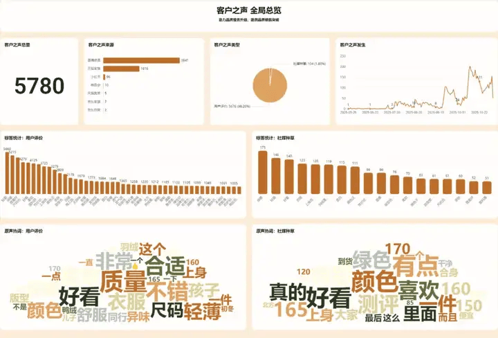 更贴心的是,系统预设了专为电商打造的标签分析体系,自动将反馈分类为商品质量、物流问题、活动规则等维度,还能生成不同部门需要的报表,给商品部的是质量问题分析,给物流部的是配送时效统计,给客服的是话术以及情绪分析建议。